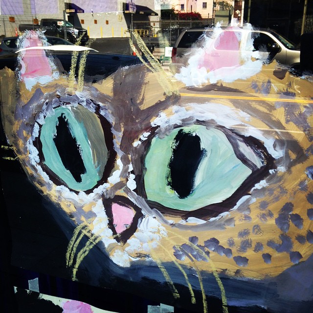 The window of ArtWorks on Melrose at the corner of Melrose and Larchmont in Los Angeles is plastered with different versions of this cat by kids ages 6-13. Had to shoot one.